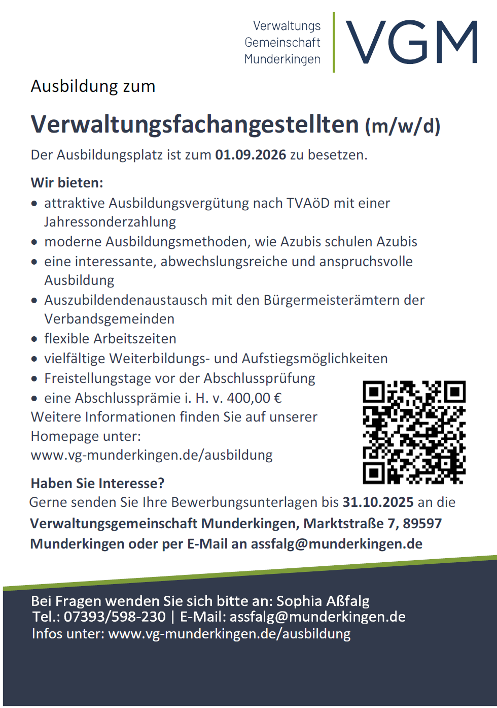 Weitere Informationen erhalten Sie auf unserer Homepage unter www.vg-munderkingen.de/ausbildung. Bei Fragen steht Ihnen Frau Aßfalg gerne telefonisch zur Verfügung.